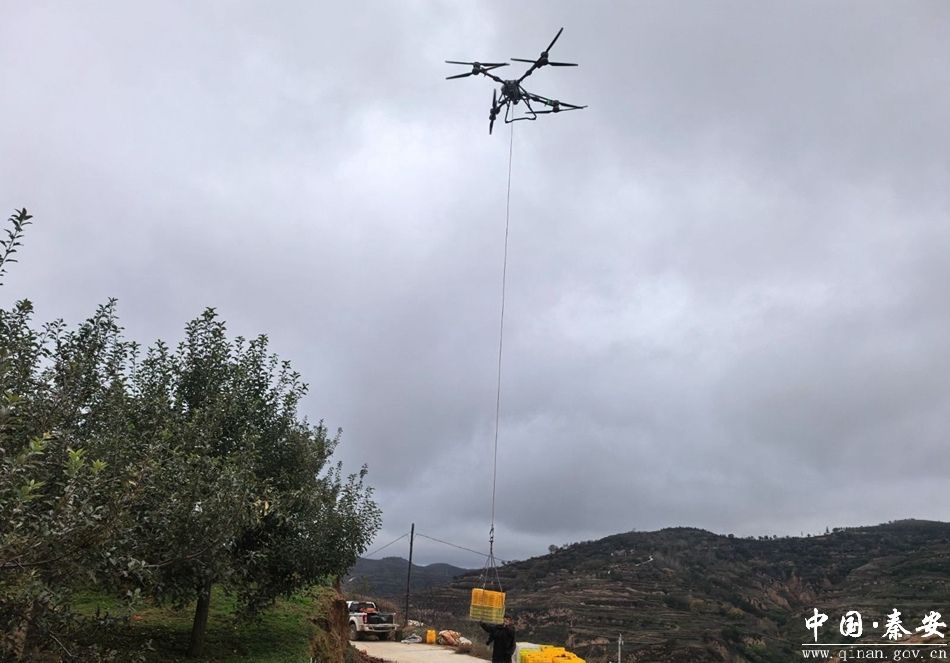 魏店镇果园大多分布在山地,道路陡峭难行,传统推车运输方式不但耗时耗力,而且效率低下,同时运输过程中损伤较多。如今无人机赋能苹果运输新模式,彻底改变了先前的弊端,提升了运输效率。无人机每次运输3筐苹果,重量120斤左右,运输过程流畅快捷,果农赞不绝口。“我们家的苹果在山坡上,通行道路不但陡峭而且狭窄,苹果运输特别艰难,特别是遇到阴雨天气,道路湿滑,根本没办法运输,只有等到转晴后才能运送苹果。现在有了无人机,半天时间就全部运完了,而且很少有磕碰,新科技就是好。”王窑村苹果种植户王先生深情地说。