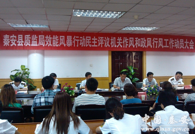 为全面贯彻落实全县和市质监局效能风暴行动民主评议机关作风和政风行风工作有关会议精神,切实加强政风行风建设,推进效能风暴行动,6月27日,秦安县质监局在秦融大酒店四楼会议室召开了2013年效能风暴行动民主评议机关作风和政风行风工作动员大会,参加会议的有:县行评代表焦一明(县政协办公室主任科员)、李军川(县广电局纪检书记),伏彦红(县纪委干部),聘任的县质监局政风行风监督员,服务对象代表,全局全体职工、电视台记者共40多人参加了会议。会议由县质监局党组成员、副局长胡锐主持。