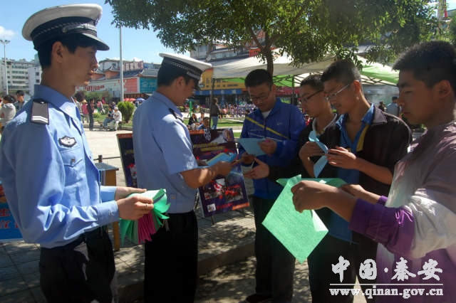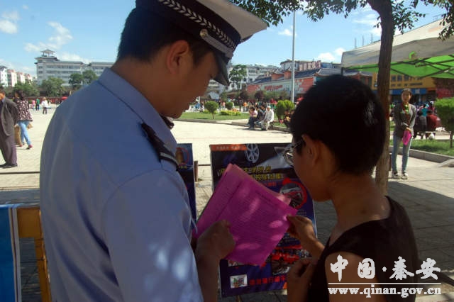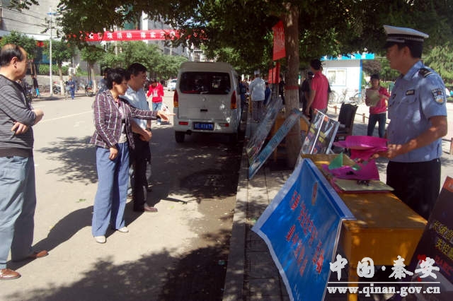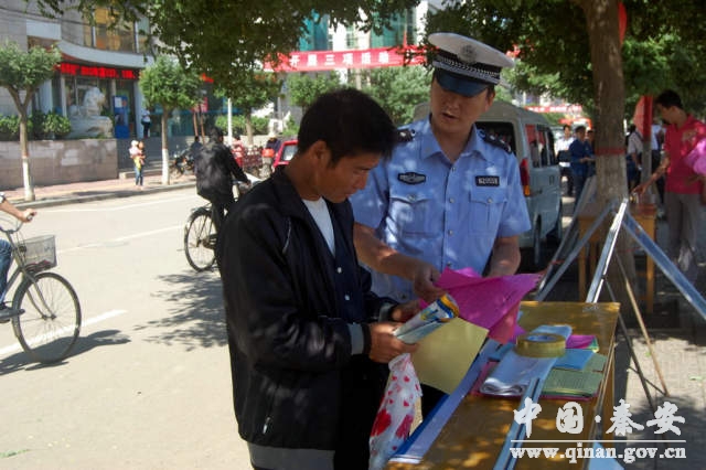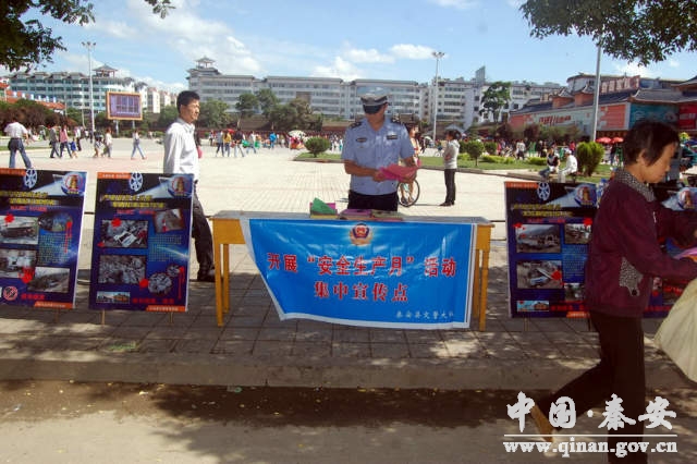 6月9日是全县2013年“安全生产月”宣传咨询日。为进一步加强全县2013年道路交通安全工作,全面推进实施道路交通安全三年攻坚目标任务,根据县委、县政府的统一安排,秦安县交警大队在兴国文化广场积极开展了2013年“安全生产月”宣传咨询活动。期间,县委副书记、县长程江芬等县上领导对活动进行了指导检查。