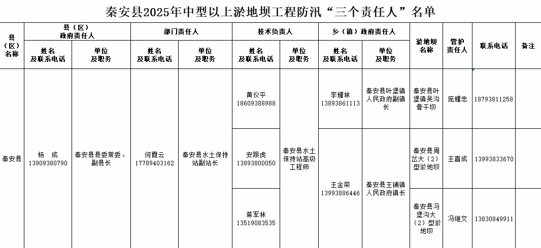 秦安县2025年中型以上淤地坝工程防汛“三个责任人”名单