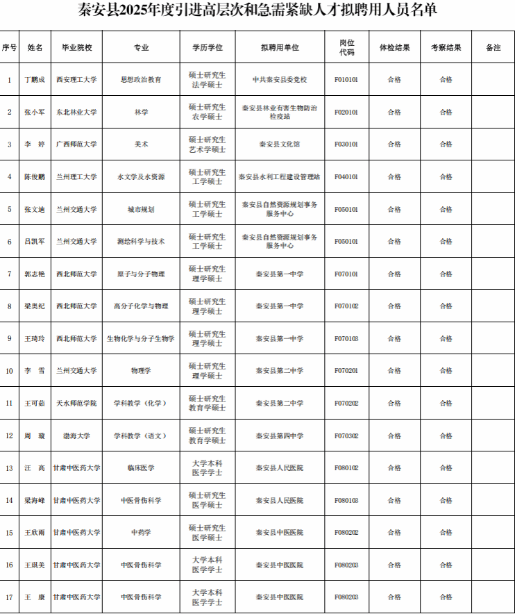 按照《天水市2025年度引进高层次和急需紧缺人才公告》要求,经资格审查、面试考核、资格复审、体检、组织考察等程序,确定丁鹏成等17名同志为拟聘用人员,现将拟聘用人员名单予以公示,接受社会监督。