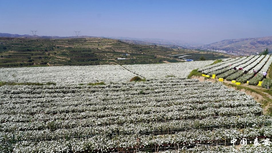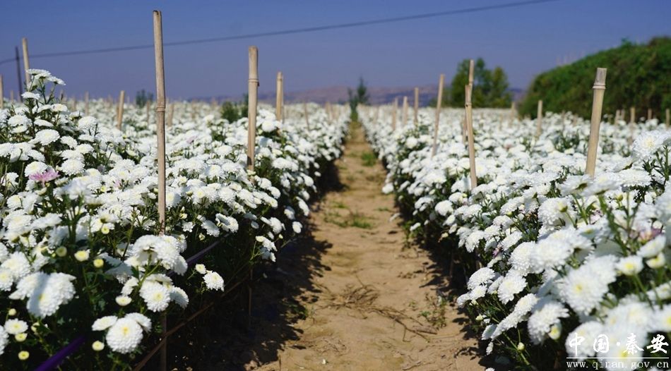 秋来采菊忙,添得满袖香。时下,位于秦安县陇城镇山王村农业专业合作社的50多亩菊花花开正好。走进菊花种植基地,仿佛置身于一片花海,处处菊香弥漫。放眼望去,层层叠叠的菊花竞相绽放,一垄垄,一簇簇与田野山径交相辉映,勾勒出一幅美丽的画卷。拎筐提篮的村民穿梭忙碌于田间地头,采摘、分拣,一派热闹繁忙的丰收景象。