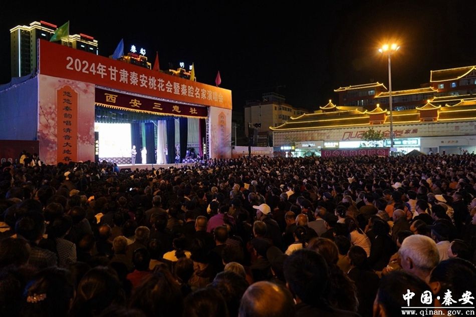 “咚锵咚锵,咚咚锵……”在2024年甘肃秦安桃花会系列活动——秦腔名家戏曲综合晚会的展演现场,来自西安三意社的演员们神采奕奕、精神百倍,戏台之下,人山人海、密不透风。