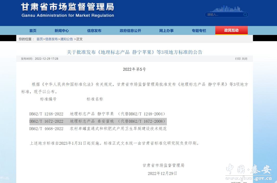12月29日,甘肃省市场监督管理局发布2022年第5号公告,由秦安县政府主导,县市场监管局、县果业管理局起草并组织申报的《地理标志产品 秦安蜜桃》省级地方标准于2022年12月29日正式批准发布,并将于2023年1月31日正式实施。这是继《地理标志产品 秦安苹果》《地理标志产品 秦安花椒》地理标志产品地方标准获批发布后秦安获得的又一殊荣。