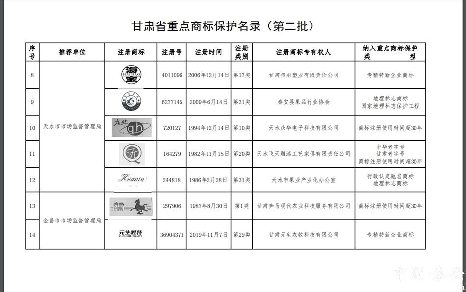 日前,甘肃省市场监督管理局公布《甘肃省重点商标保护名录(第二批)》,秦安县推荐的甘肃福雨塑业有限责任公司“海宝”商标与县果品行业协会“秦安蜜桃;MT”商标双双入选,成功实现一县两标同时跻身省级重点商标保护行列。这标志着秦安县在深化商标品牌战略、强化知识产权保护、优化营商环境方面取得重要突破,为县域产业升级与高质量发展注入新的品牌动能。