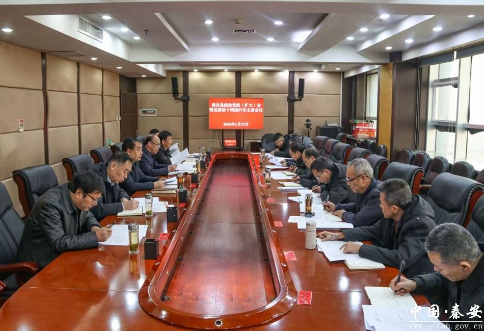 会议传达学习了习近平总书记二〇二六年新年贺词、习近平总书记在全国政协新年茶话会上的重要讲话精神、习近平总书记对做好“三农”工作的重要指示精神和中央农村工作会议精神、习近平总书记对未成年人思想道德建设作出的重要指示精神和未成年人思想道德建设工作座谈会精神、中国共产党第二十届中央纪律检查委员会第五次全体会议公报、习近平在二十届中央纪委五次全会上的重要讲话、中央层面整治形式主义为基层减负专项工作机制会议精神和胡昌升对天水市工作作出的批示精神。审议通过了《县政协领导班子2025年度民主生活会对照检查材料(征求意见稿)》,研究了关于春节期间慰问及《安维峻传》的有关事宜。