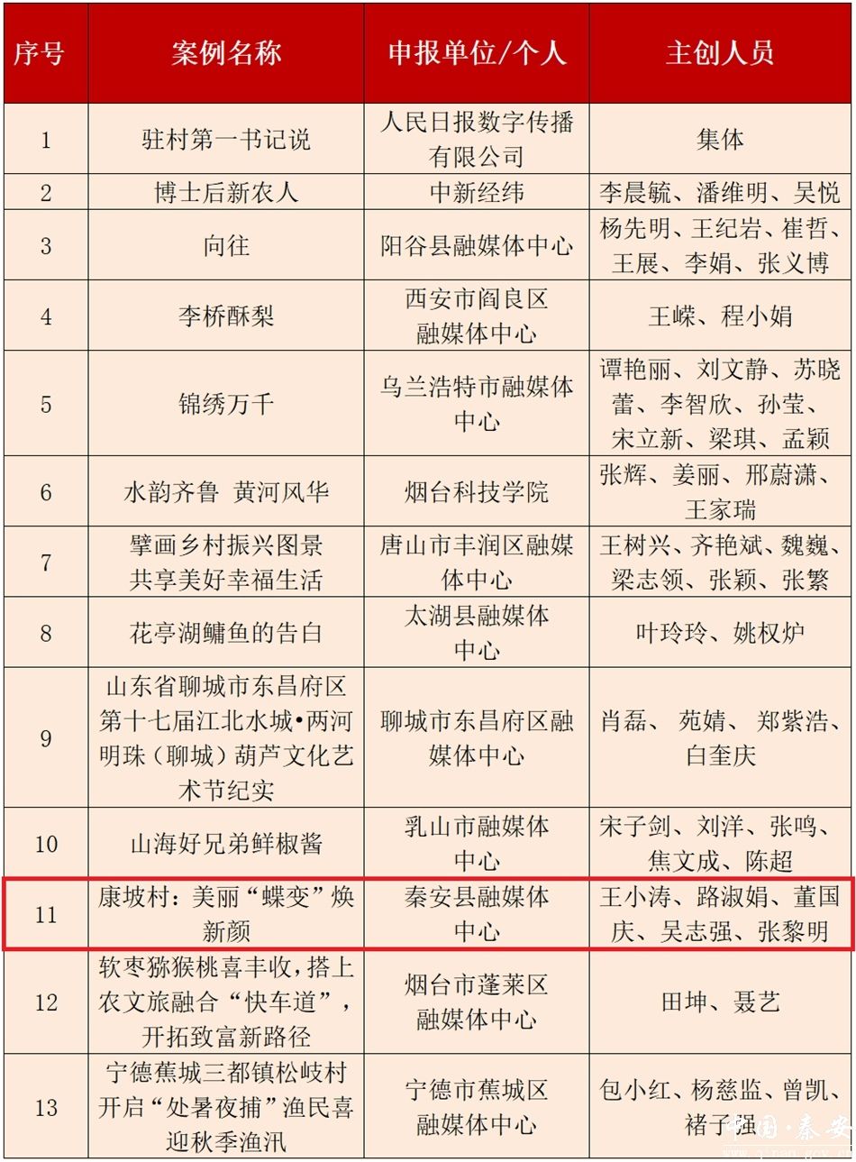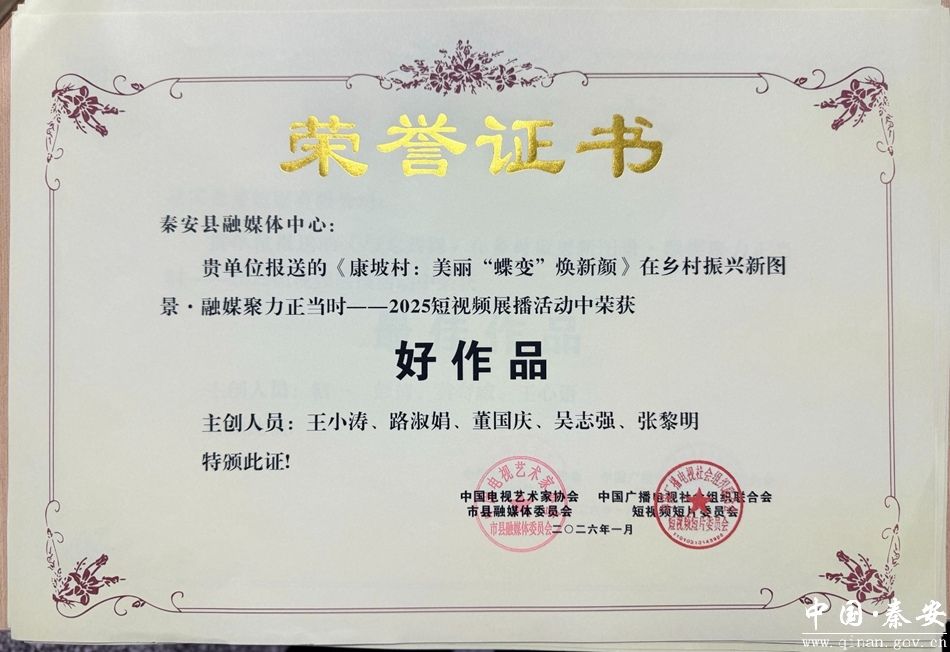 1月31日,全国市县融媒体优秀作品暨案例推优盛典在福建尤溪举办,来自全国各地的行业主管领导、融媒领域专家学者以及一线融媒体工作者齐聚一堂,以融媒为桥,共话融合发展新方向,共探乡村振兴新路径,凝聚起市县融媒体赋能基层发展的强大合力。在此次盛典上,秦安县融媒体中心报送的短视频作品《康坡村:美丽“蝶变”焕新颜》入选“乡村振兴新图景·融媒聚力正当时”——2025短视频推优活动好作品,此次荣获全国荣誉正是秦安融媒近年来坚持守正创新、深耕融合发展的生动缩影,也是对秦安融媒在技术创新应用、内容创作生产等方面工作的充分肯定。