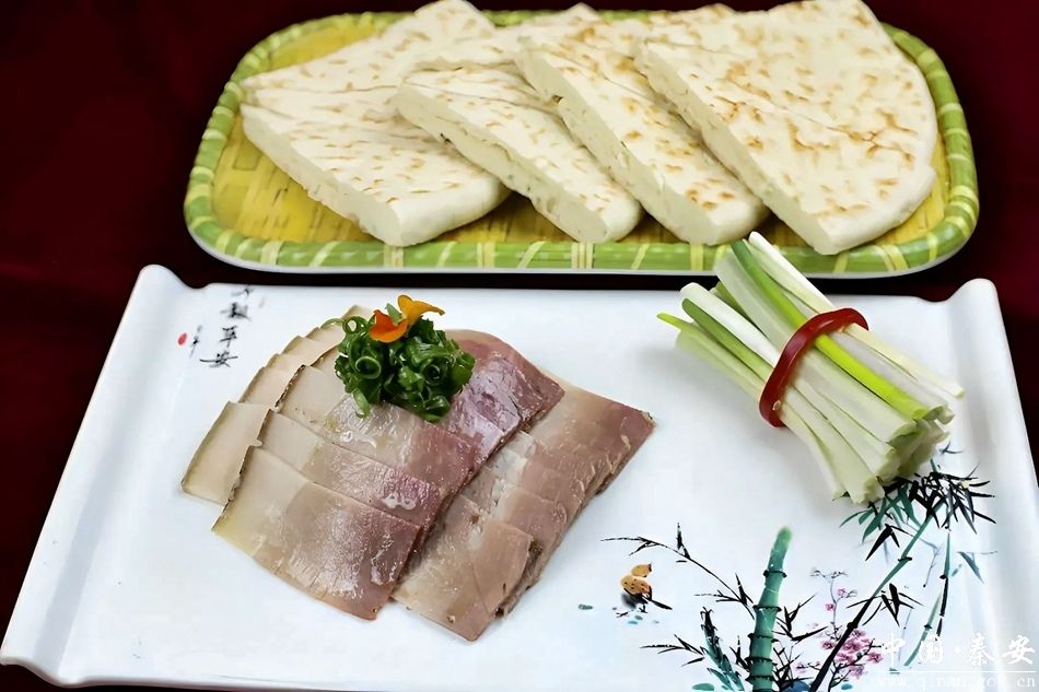 一饼承腊味,烟火暖人心。腊肉带饼是秦安独有的风味吃法,将风干到位的腊肉蒸制切片,油脂温润、腊香浓郁;搭配本地手工烙制的薄饼,外酥内软、麦香十足。薄饼一卷腊味,肉香与面香在口中交融,咸鲜适口、回味悠长,既可作为早餐暖胃,也能上桌成菜、待客迎宾,是老少皆宜的经典美味。