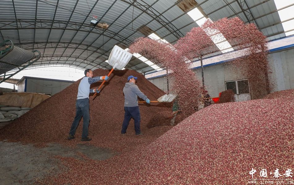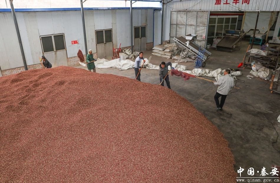 (秦安县郭嘉镇乐星花椒有限公司生产车间工人现场作业翻捡花椒)