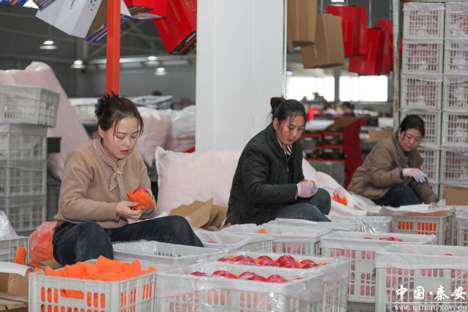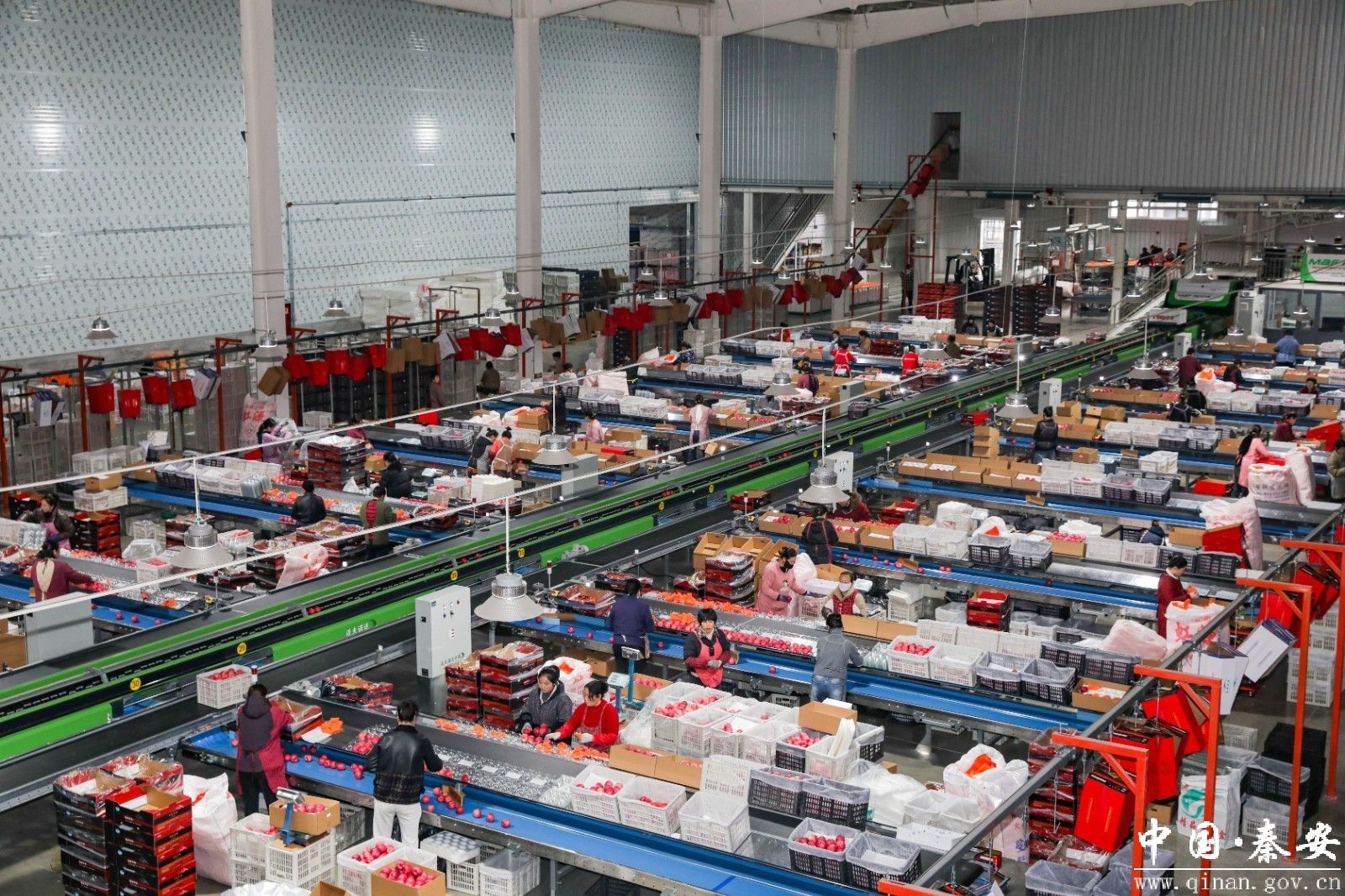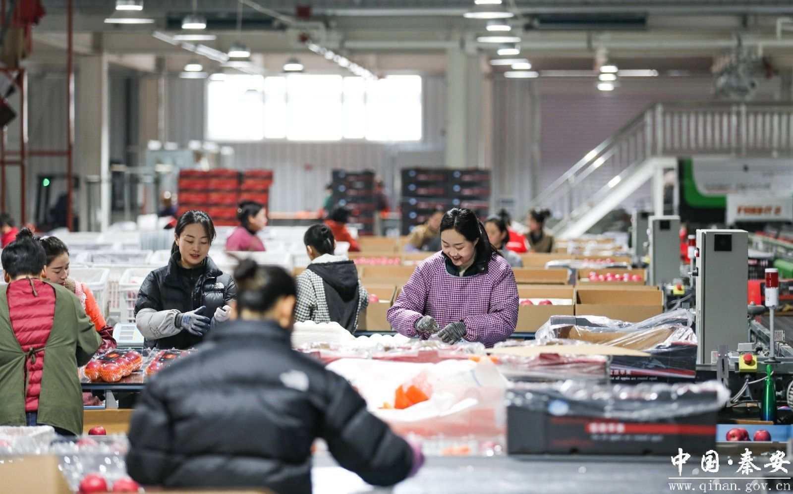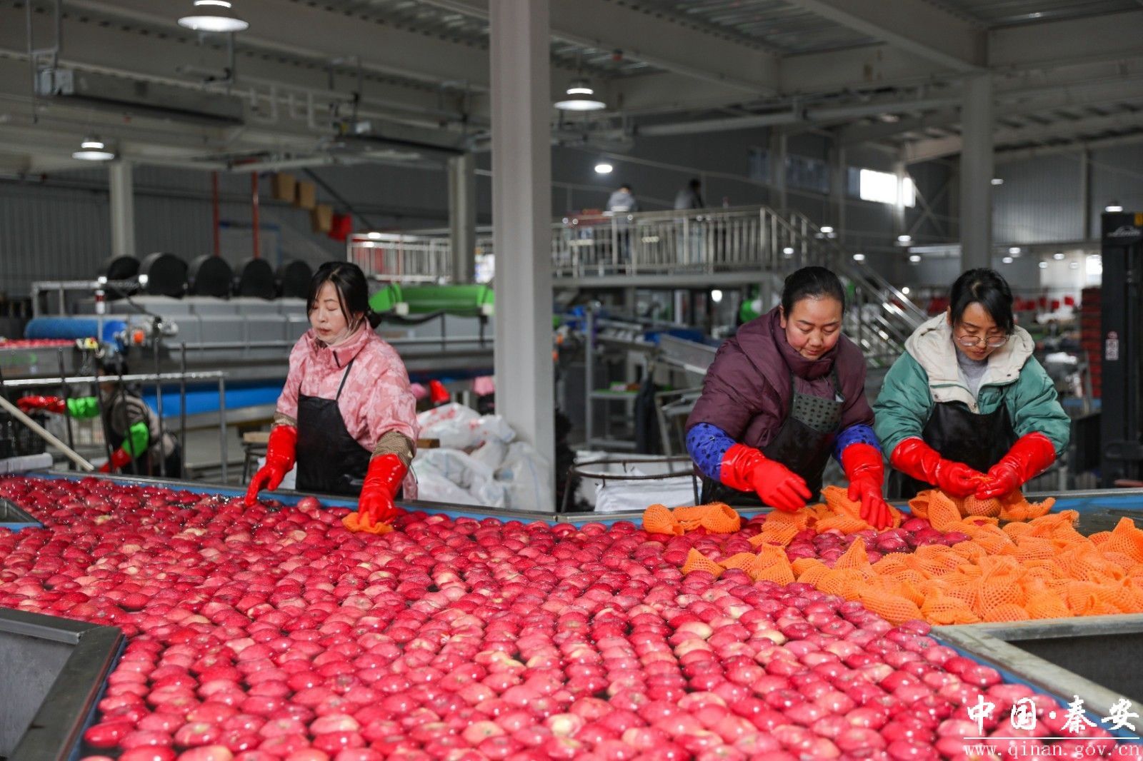 生产线上,一颗颗色泽红润、饱满圆润的秦安苹果经过清洗、分拣、分级,被工人们熟练地套网、贴标、装箱,现场一派热火朝天的景象。