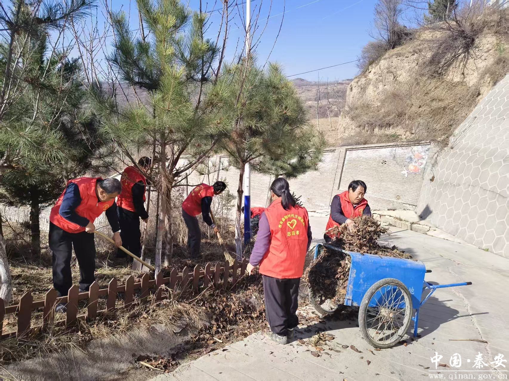 活动现场,志愿者闻令而动、分工明确。在村内主干道沿线,大家手持铁锹、扫帚,俯身对树木围栏周边的积存枯草、枯枝落叶及各类杂物进行拉网式清理。大家默契配合,有的挥锹铲草,有的扫落叶归堆,有的合力转运,短短时间内,就让道路周边面貌焕然一新。