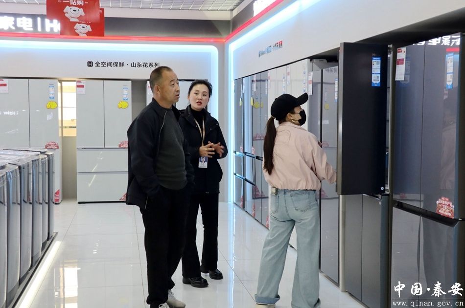 在京东家电秦安金鑫家居店,店内醒目位置张贴着政策海报与操作指南,冰箱、洗衣机、空调、电脑等补贴专区产品摆放整齐,工作人员向市民讲解补贴标准与申领流程。