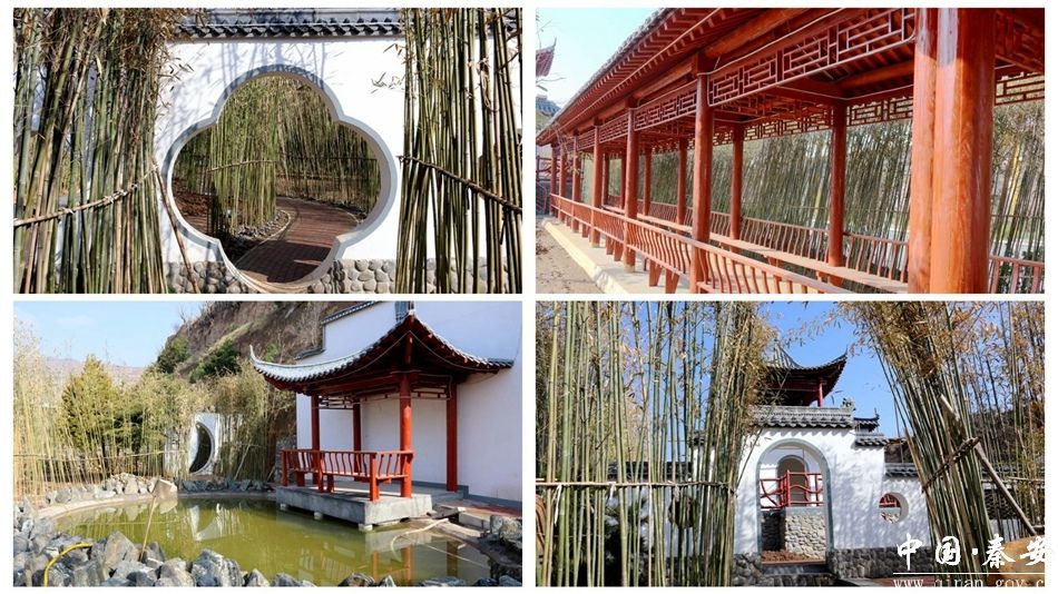 与花海柳堤的明快艳丽不同,一街之隔的花篅竹韵口袋公园更显清幽雅致。公园以翠竹为脉络,自东向西串联起多处园林节点,漫步其间,竹林苍翠、景致错落,一步一景、移步换景的造园效果尽显韵味。粉墙黛瓦掩映在茂林修竹之中,很难想象,这里曾是山脚与公路之间的一片闲置空地。该公园占地5.6亩,整体划分为两大区域,建成了九逸长廊、陇川书院·城市阅读书屋、望月楼、可泉亭、竹韵长廊等休闲设施,并精心打造富贵门、新月门、城洞门、葫芦门、八角门、宝瓶门、满月门、海棠门、月洞门等江南九道门,形成独具特色的园林景观。在植物配置上,公园选用雪松、合欢、桂花、柿子树、垂柳等乡土适生树种,搭配4万余株绿水竹与彩叶灌木,草木葱茏、生机盎然,既显自然野趣,又有地域特色。公园在造景中深度融入秦安历史文化底蕴,将胡缵宗、李白等本土及历史文化名人元素植入景观设计,名人诗词、人文印记与园林景致相映成趣,让市民在休闲游憩中沉浸式感受传统文化的深厚魅力。整体设计兼具自然之美与人文之韵,贴心满足市民休憩、观景、阅读等多元需求,构筑起一处静谧雅致、文景交融的城市便民休闲空间。