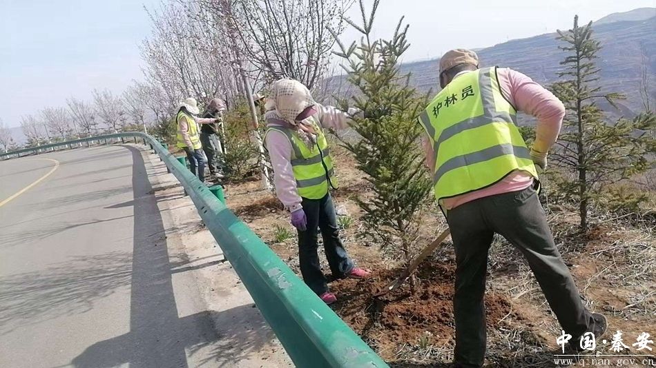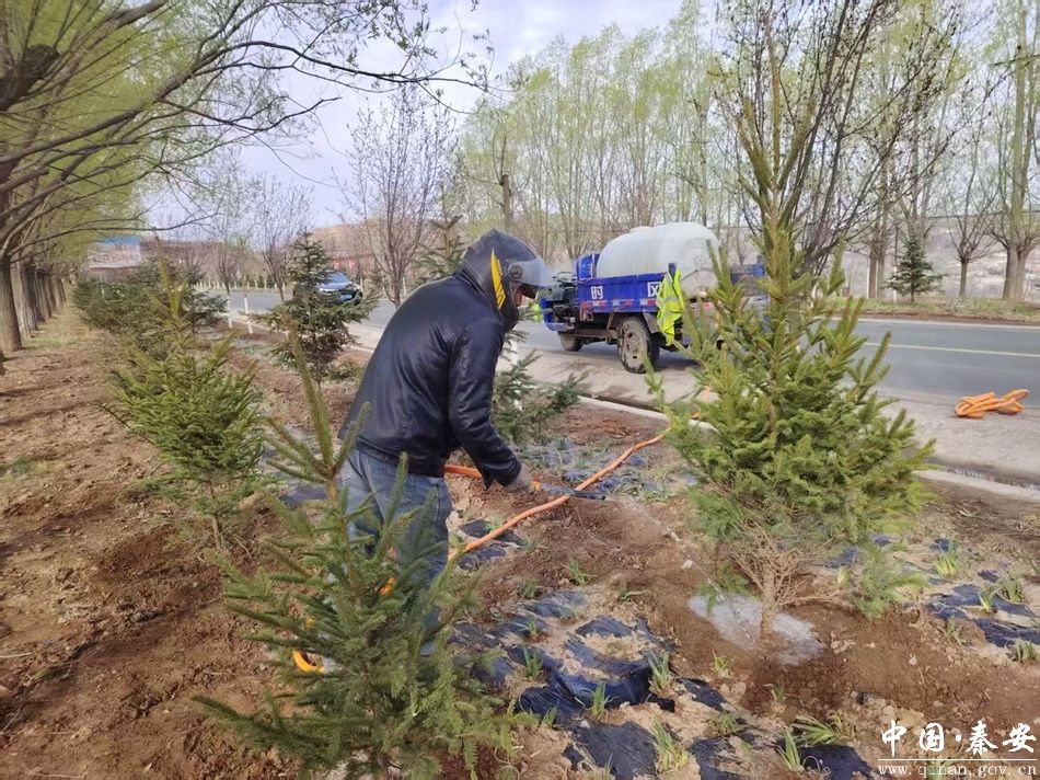 在泾甘公路千户段,大家分工协作,挥锹铲土、扶苗填坑、踩实浇水,每个环节都一丝不苟。一株株新栽的云杉苗木迎风挺立,为春日的乡村道路增添了勃勃生机。