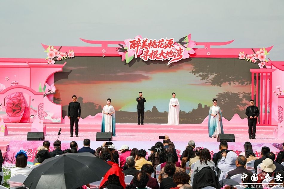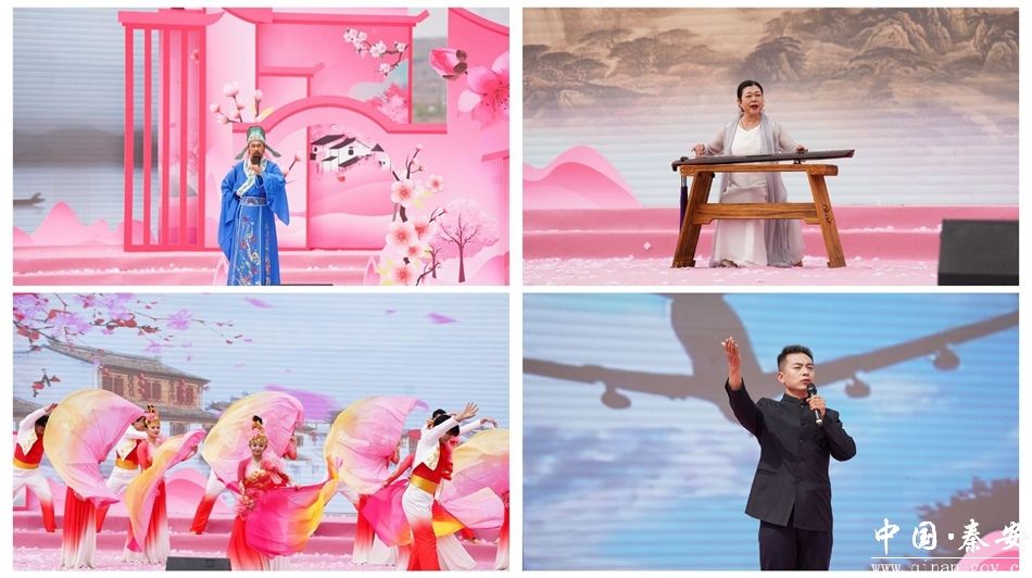 活动在气势恢宏的开场舞《锦绣桃乡》中震撼开场,舞者们身着华美的服饰,以灵动飘逸的舞姿,在万亩桃林的天然背景下,演绎出秦安桃乡的锦绣风光,为整场活动奠定了浪漫而热烈的基调。随后的《诗经·秦风——蒹葭》《诗经·秦风——无衣》吟诵环节,古琴、箫声婉转流淌,配合朗诵与独舞表演,带领观众穿越千年,重温先秦诗歌的质朴与深情。唐诗演诵《行吟陇右》将李白、杜甫与天水的深厚联结娓娓道来,以诗为媒,再现两位诗圣在陇原大地留下的千古绝唱。配乐诗朗诵《天水长歌》则用铿锵有力的声音,诉说着这座古城的岁月流转与人文风骨。最后,歌曲《美丽天水》把对家乡的热爱与赞美推向了高潮。