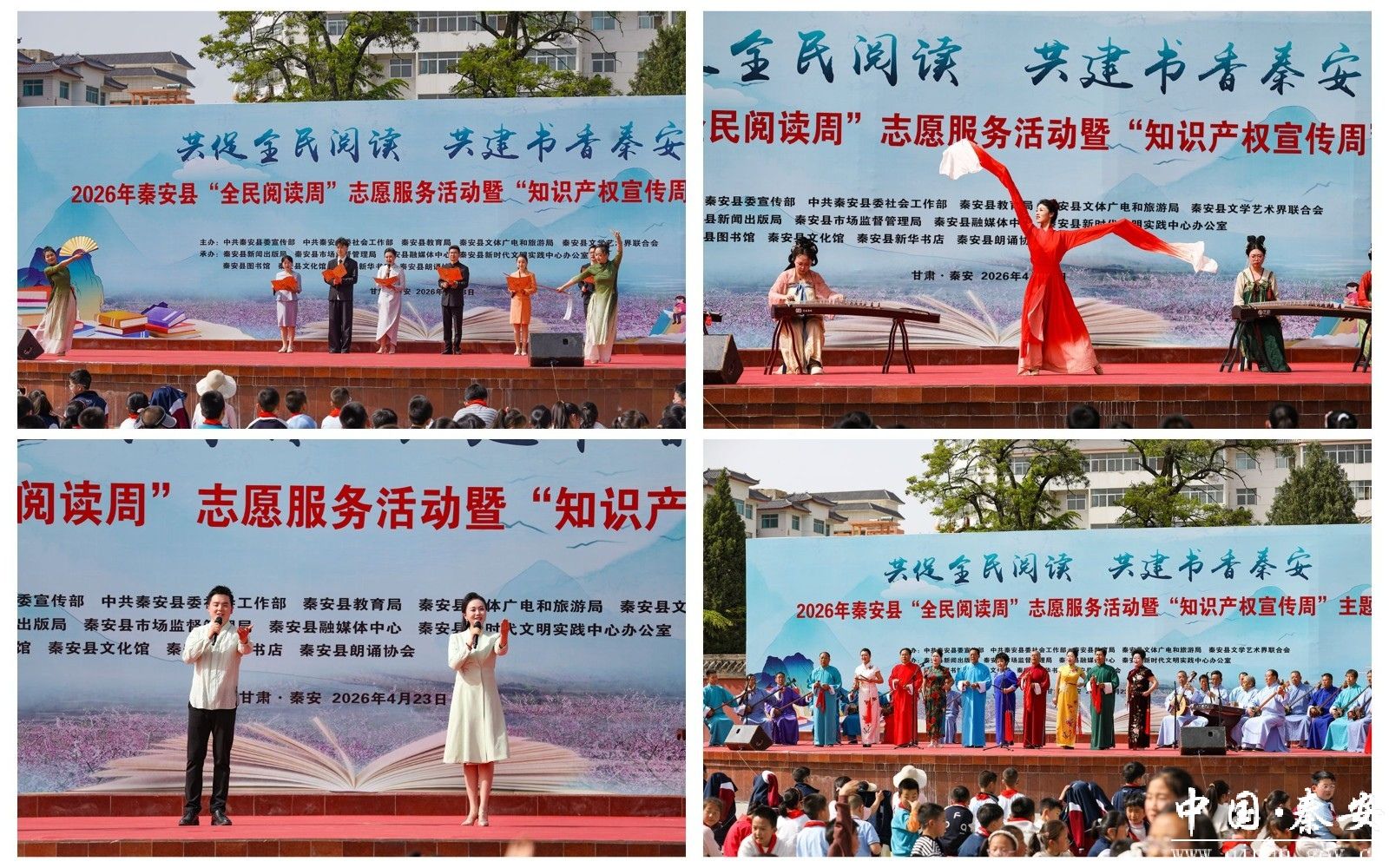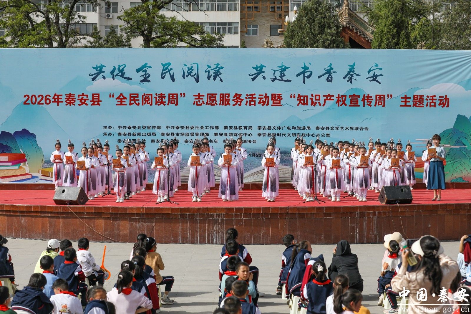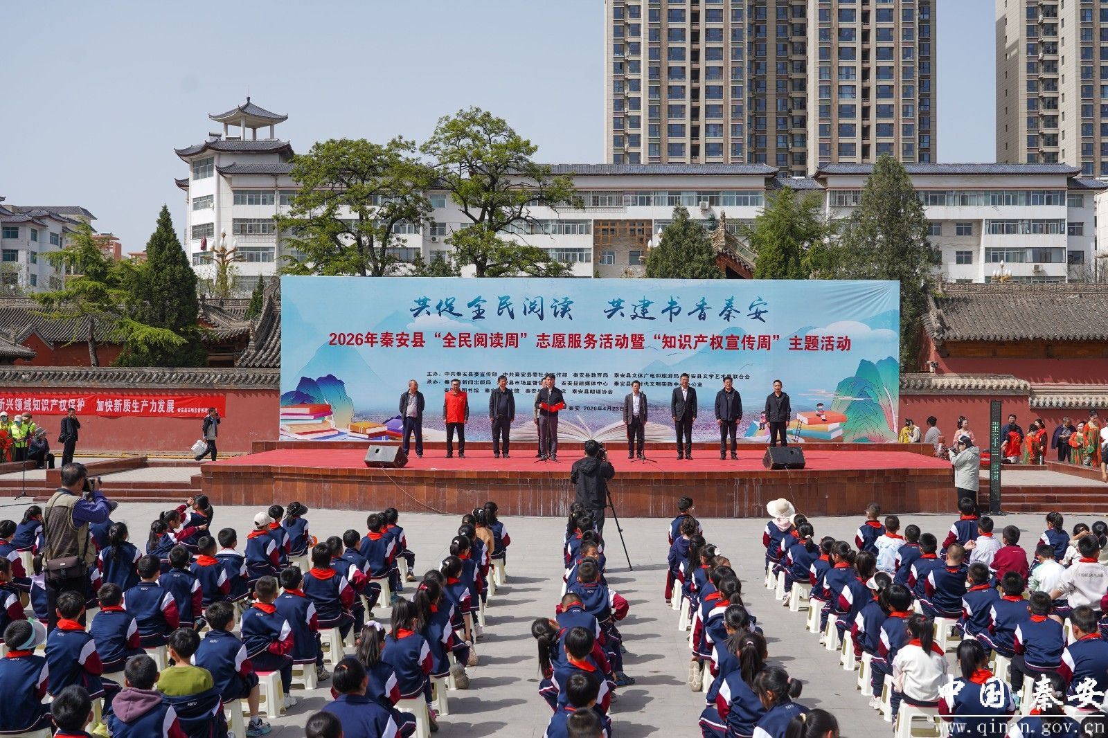 4月23日,2026年秦安县“全民阅读周”志愿服务活动暨“知识产权宣传周”主题活动在县兴国文化广场启动。县领导陈升、张百年、雒小军及县直部门单位、人民团体、相关企业、各镇分管负责人和农家书屋管理员代表共计200余人参加活动。