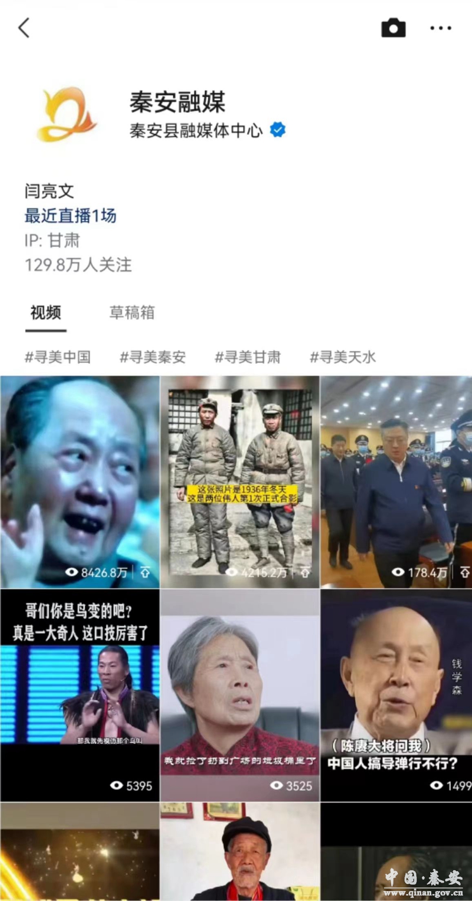 “ 秦安融媒”视频号自2021年8月开通以来,突出专业化,在努力深耕本土,讲好秦安故事、传播秦安声音的权威信息发布渠道基础上,坚持以优质内容及思想观点去强信心、暖人心、聚民心、筑同心,选题突破本地局限,发布内容涵盖全国热点,推出了一系列“爆款”产品,在舆论引导、服务民生、普及知识等方面作了大量尝试,为网友传播了优质、正能量新闻,粉丝黏度不断提高、网友关注喜爱程度日益增加,账号传播力、引导力、影响力不断提升,成了媒体视频化转型、全面融合的一个新平台。