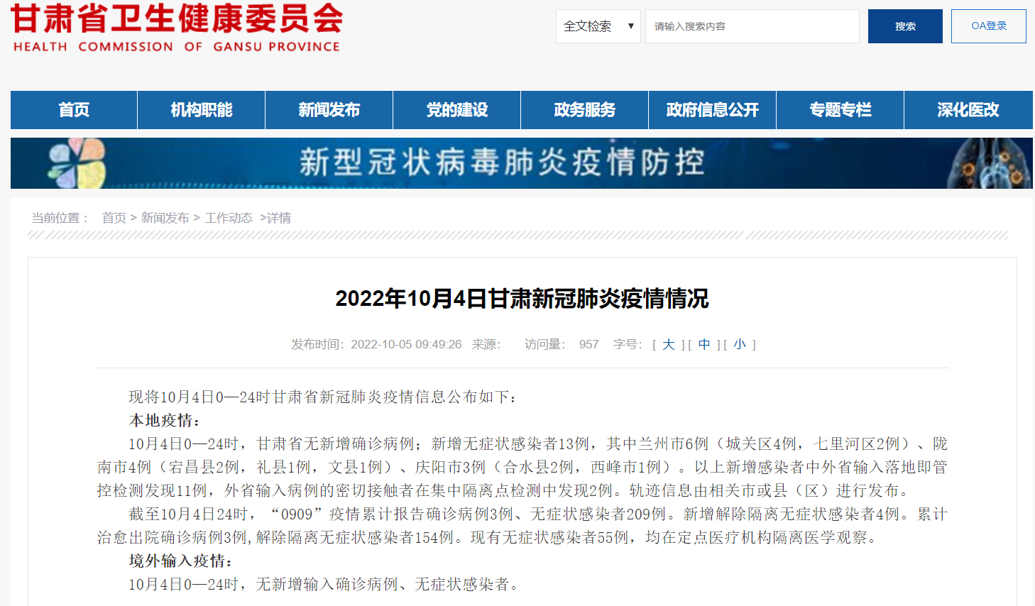 现将10月4日0—24时甘肃省新冠肺炎疫情信息公布如下: