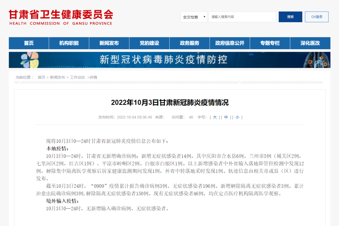 2022年10月3日甘肃新冠肺炎疫情情况