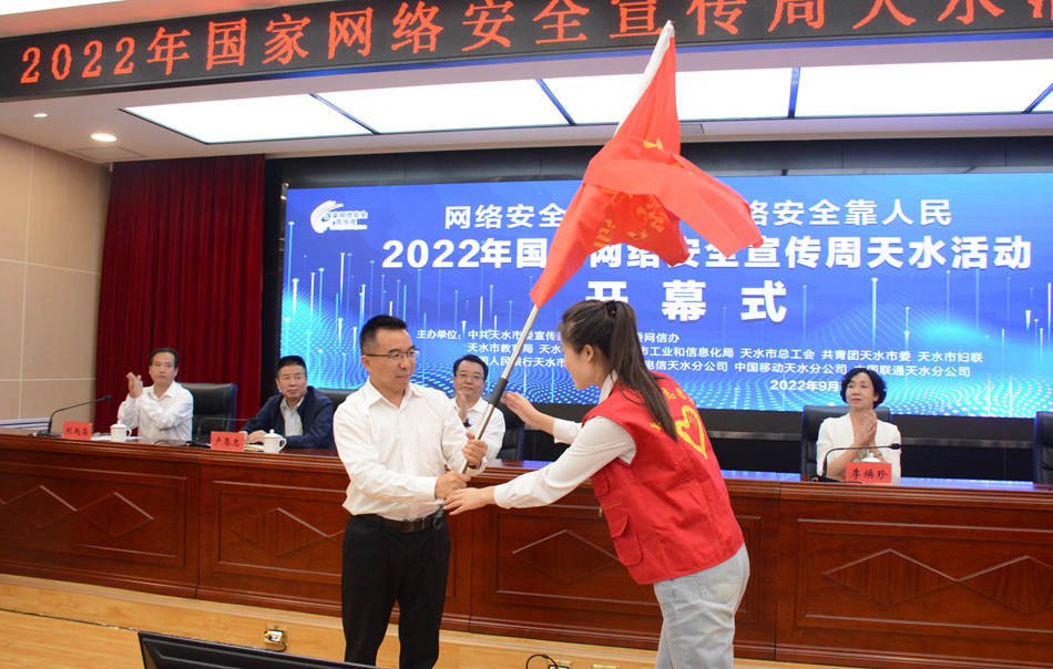 开幕式上,宣读了中共天水市委书记、市委网络安全和信息化委员会主任冯文戈同志关于切实做好2022年网络安全宣传周活动的批示;市总工会、人行天水市中心支行、中国移动天水分公司等主题日活动牵头单位作了发言;天水市网络安全宣传志愿者服务队代表宣读了《安全上网文明上网倡议书》;市政府副市长、市公安局局长郭庆祥讲话;市委常委、宣传部部长王文东向天水市网络安全宣传志愿者服务队授旗并宣布“2022年国家网络安全宣传周天水活动”开幕。