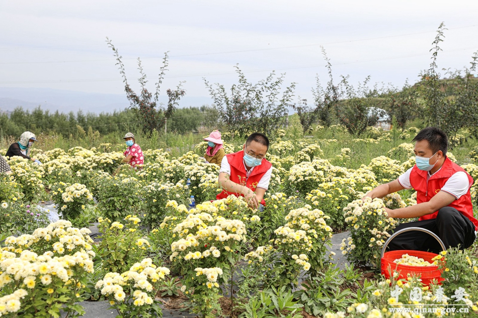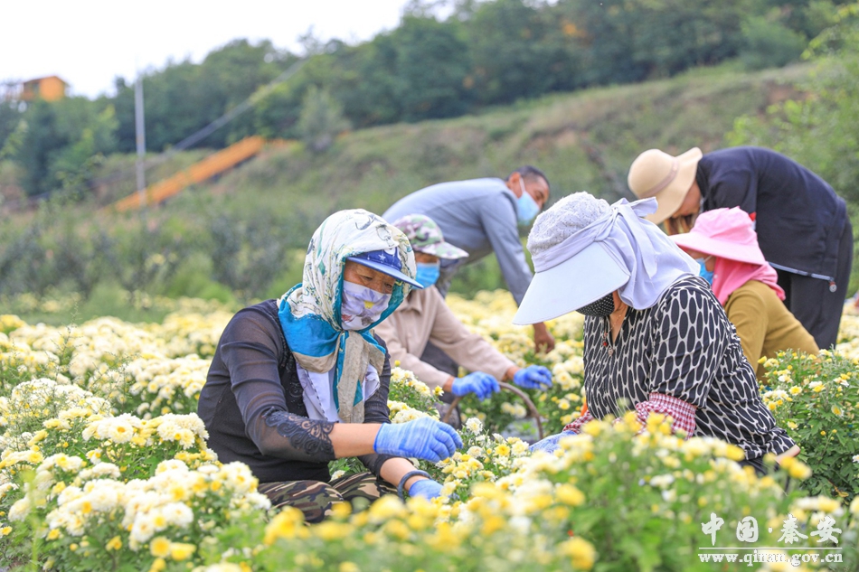 菊花产业是一个劳动密集型产业,栽植、管护、除草、栽苗都需要劳动力,种植七月菊不仅能够增加群众的收入,还能够有效解决劳动力就业的问题。岭上宏农业发展有限公司是一家集七月菊‘’收购+加工+销售‘’为一体的公司,已经扎根当地多年,走出了一条“党支部+龙头企业+特色产业+农户”的脱贫致富新路子。