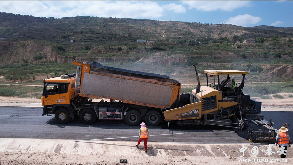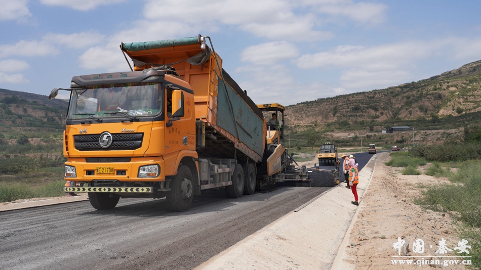近日,记者在秦安县Y418线叶堡镇新阳村至魏店镇伏峡村公路建设(一期)工程郭嘉镇涡坨村段看到,公路建设已进入最后铺油阶段,沥青摊铺机缓缓向前推进,压路机有条不紊地作业,一辆辆运送沥青混合料的货车来回穿梭,施工人员配合车辆修整路面,施工负责人和监理人员现场进行监督和检测,工人们抢进度、保工期,确保道路早日铺油通车。