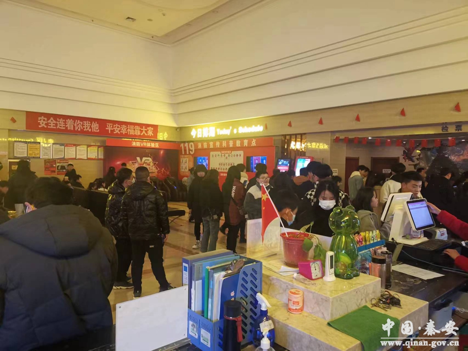 随着许多新春贺岁片的蓬勃上映,春节看电影也成了越来越多市民度假的选择。在太平洋影城秦安店, 服务台前挤满了咨询视频、购票的观众,等候厅的座位上更是人满为患,自动取票机,也排起了长队。 看电影的除了年轻的情侣以外,还有很多老年人和孩子。电影院里气氛火爆,年味十足。“爷爷奶奶听说今年上映的《满江红》和岳飞有关,就与我们一起来看电影,爸爸妈妈都喜欢张艺谋导演,我和爱人也喜欢悬疑电影,就一口气买了6张票。”吴飞告诉记者。记者从影院了解到,春节期间,全县电影市场火爆,春节档票房达到72万元,同比2022年增长18.4%。