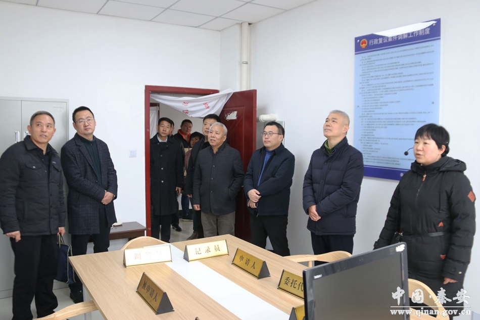 在县司法局,考察组实地查看了行政复议服务中心接待大厅、审理室、调解室、档案室等功能室建设,详细了解了秦安县在开展行政复议工作中的经验做法。