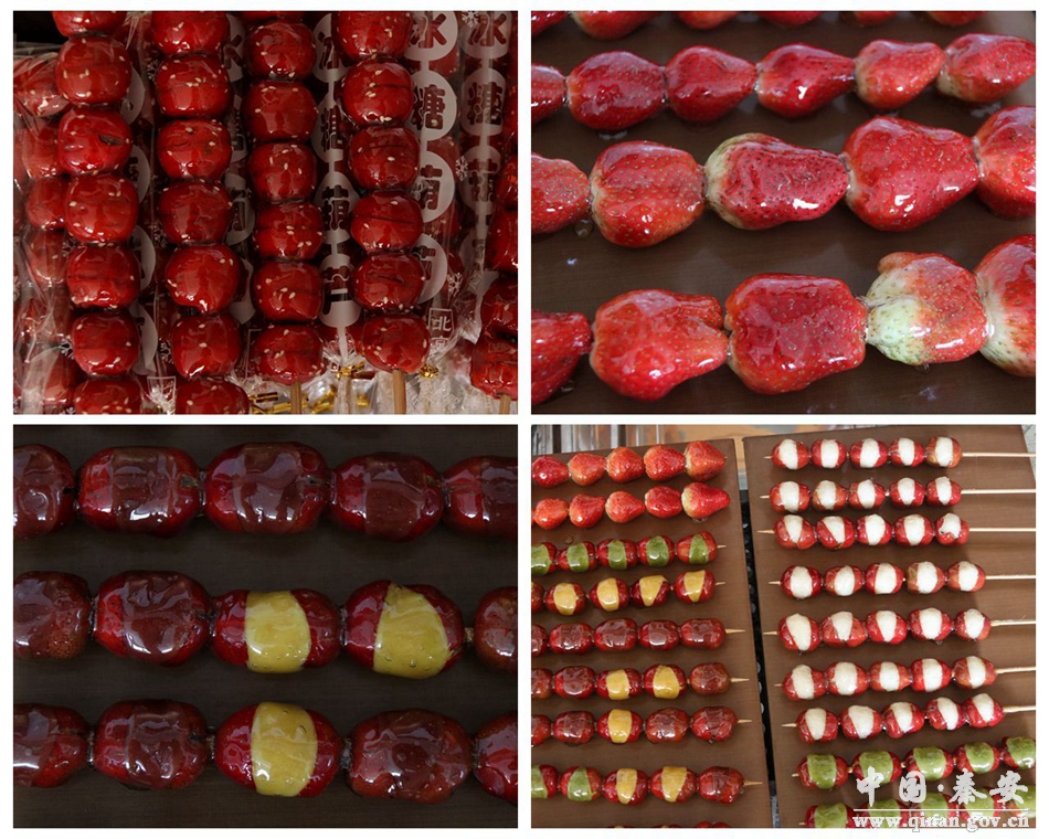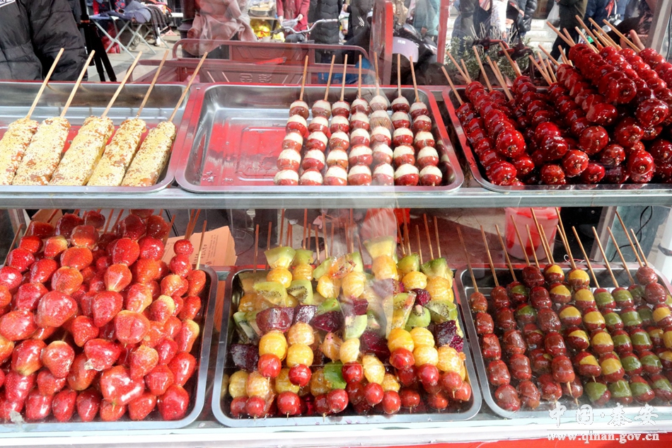在秦安县步行街糖葫芦销售点,只见来买糖葫芦的顾客络绎不绝,摊主不停地拿葫芦串裹糖衣、装袋,一刻也不闲着。一支支穿满晶莹剔透的红果小串,一口咬下去,咯崩一声脆,甜而不腻,酸不倒牙,非常惹人馋。