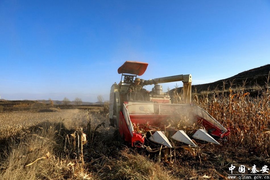 连日来,甘肃省天水市秦安县中山镇田间地头一派丰收盛景。黄树湾流域与姚沟村的玉米种植基地内,大型联合收割机沿着田垄匀速前行,切割、脱粒等一气呵成,机器的轰鸣声中,满是丰收的喜悦。