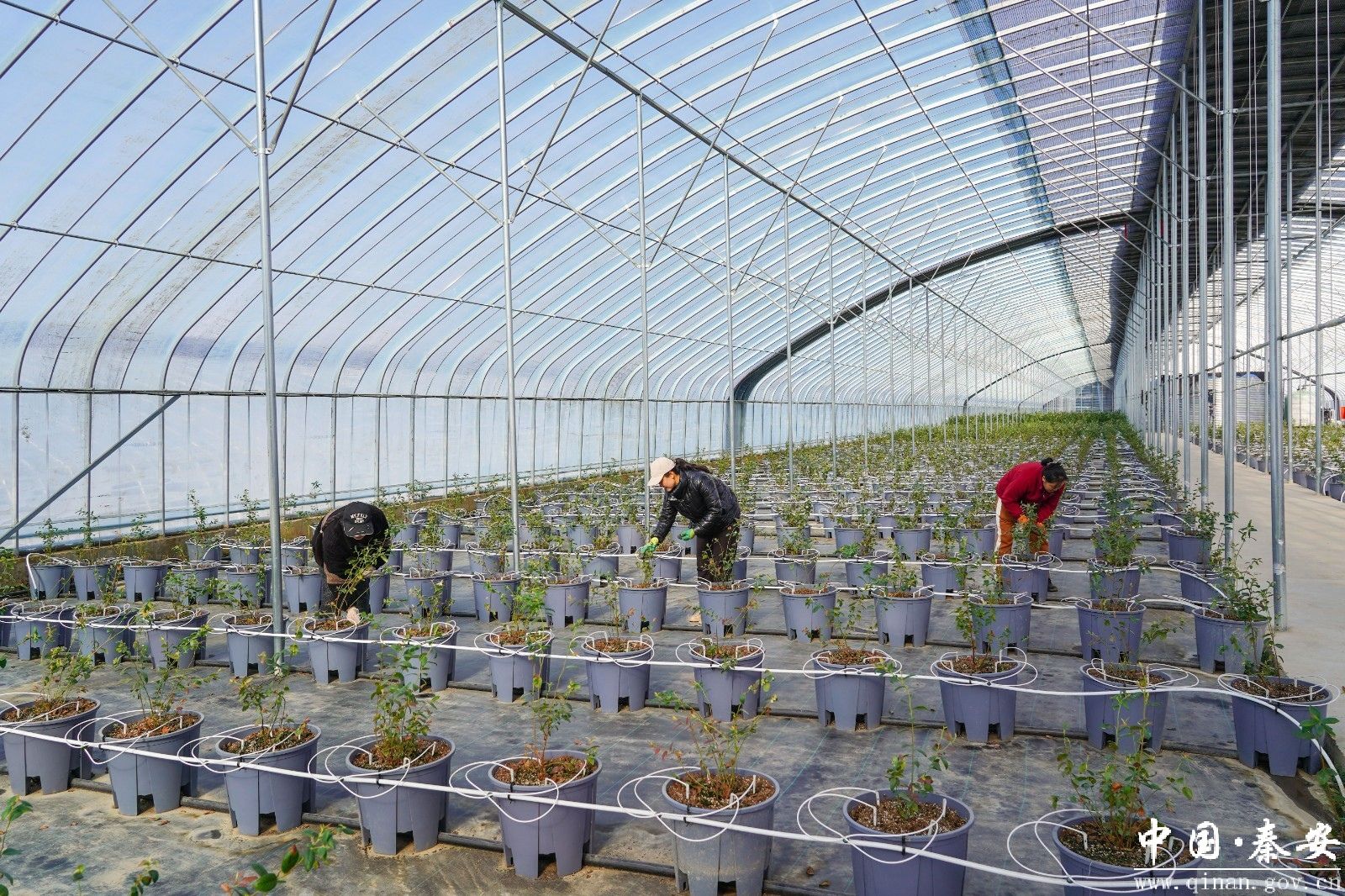 寒冬时节,甘肃秦安县陇城镇张沟村的蓝莓种植大棚内暖意融融、绿意盎然。技术人员正穿梭于一排排蓝莓苗间,一边照料着育苗钵中茁壮成长的新苗,一边为已挂上洁白小花的大苗疏花修枝。滴灌系统在垄间均匀铺开,智能化水肥管理为蓝莓生长提供精准呵护,棚内一派繁忙有序的生产景象。