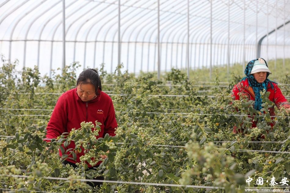 寒意未消,甘肃省秦安县陇城镇张沟村蓝莓产业基地的智能温室大棚内却暖意融融、生机盎然。一排排蓝莓植株枝繁叶茂,乳白色铃铛状花朵缀满枝头,部分早熟果实已泛出淡蓝光泽,工人们穿梭其间疏花、控温,为批量上市做最后准备。