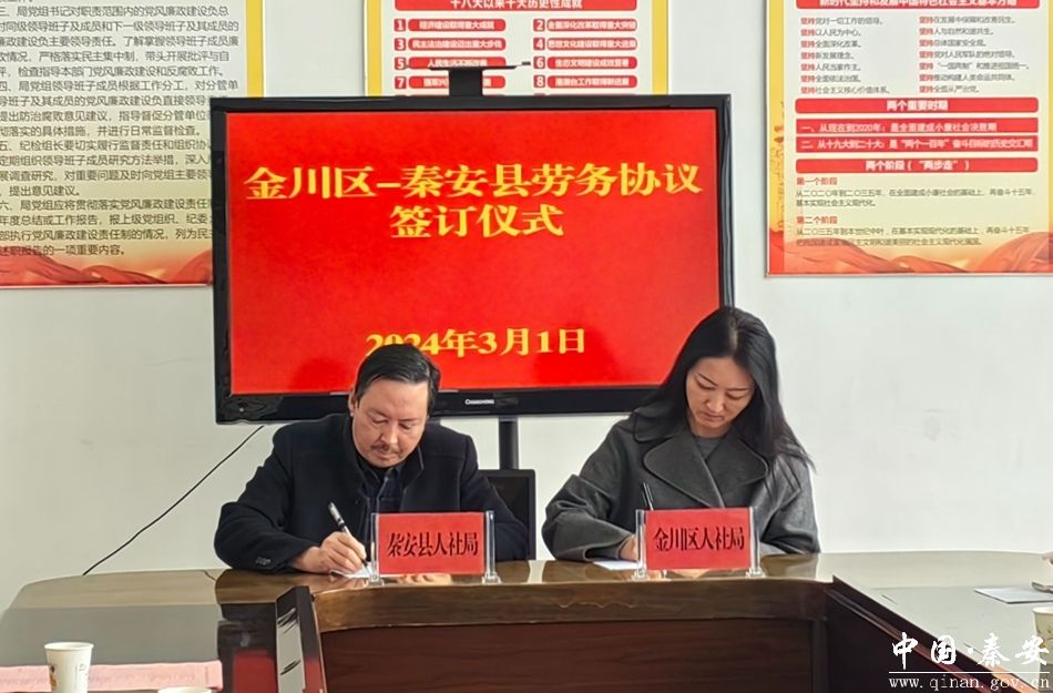 3月1日,金昌市金川区人社局负责人一行来秦安县,就进一步加强金川区与秦安县劳务合作,促进两地人力资源和用工岗位互补,推动两地经济高质量发展进行了座谈签约。