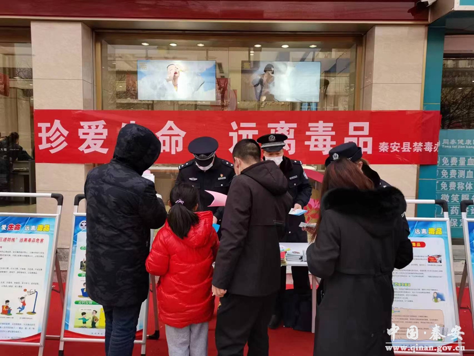 岁末临近,新春将至,为提高全县广大人民群众识毒、防毒、拒毒意识,充分调动人民群众参与禁毒活动的积极性,营造健康无毒、欢乐祥和的春节氛围。根据省市禁毒办在春节期间组织开展“禁毒宣传进万家”的活动要求,1月10日,秦安县禁毒办利用学生放假、外出务工人员返乡回流和乡镇群众进城办年货“赶大集”的有利时机,深入兴国镇商业步行街开展禁毒宣传活动。