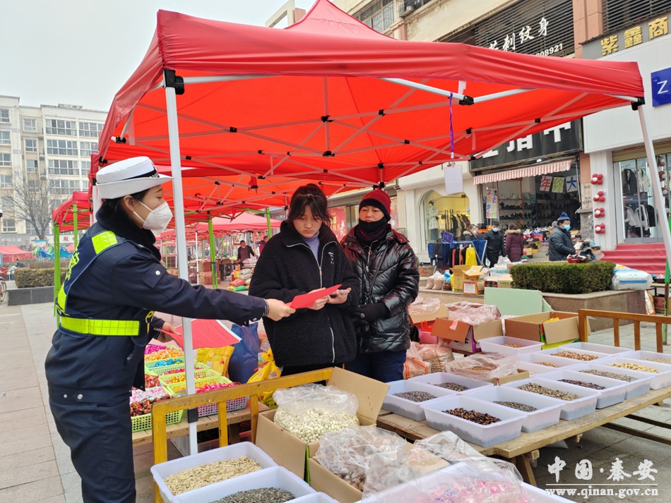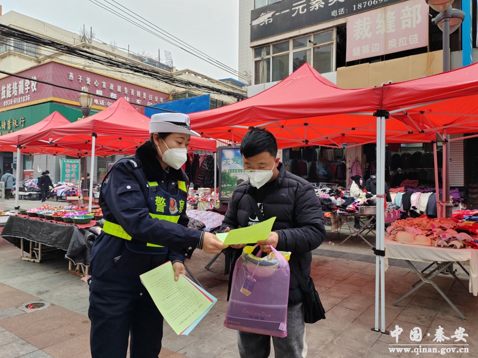 春节临近,正值群众大量购置年货时期,为进一步提高广大群众的交通安全意识,有效预防和减少道路交通事故的发生。1月4日,秦安县公安局交警大队组织宣传民辅警深入辖区年货集市摊点宣传道路交通安全知识,为百姓送上一堂交通安全教育课。