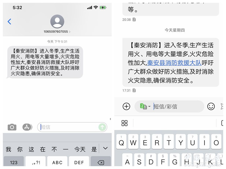 “【秦安消防】温馨提醒大家进入冬季,生产生活用火、用电等大量增多,火灾危险性加大,秦安县消防救援大队呼吁广大群众做好防火措施,及时消除火灾隐患,确保消防安全。”消防安全提示短信内容丰富,言简意赅,具有很强的实用意义和教育意义。一条条温馨的消防安全提示短信走进千家万户,不断提醒广大群众消防安全的重要性和消除火灾隐患的必要性,为全县消防安全稳定打下坚实的基础。