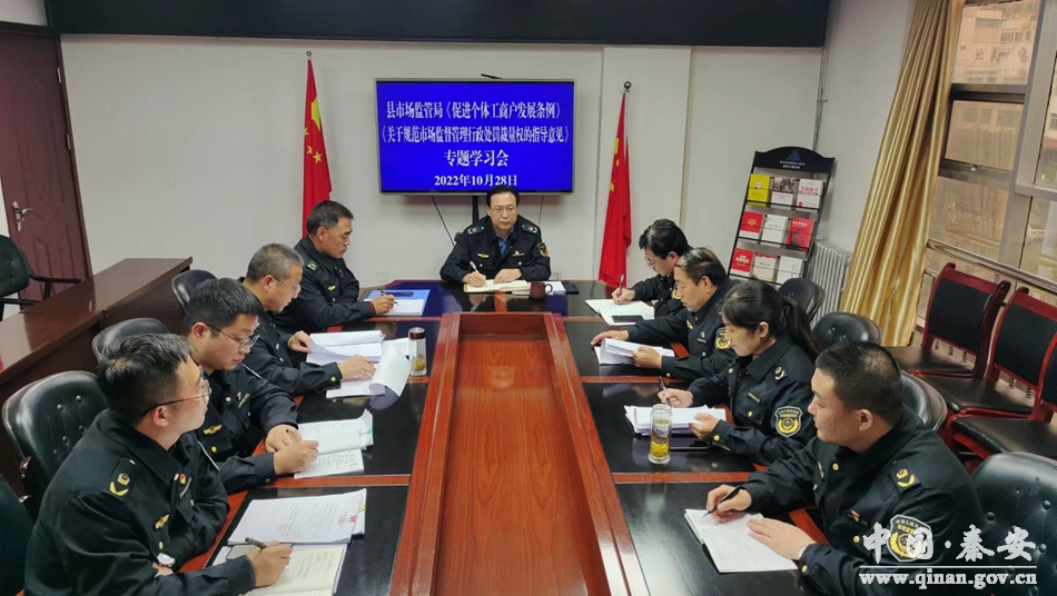 近日,国务院发布《促进个体工商户发展条例》,自2022年11月1日起施行。为充分认识《促进个体工商户发展条例》出台对促进个体工商户发展的重大意义,迅速以多种形式掀起学习宣传热潮,更好地发挥市场监管部门职能作用,推动服务个体私营经济发展工作走深走实,10月28日,秦安县市场监管局召开专题会议集中学习《促进个体工商户发展条例》,并就宣传贯彻工作提出了明确要求。