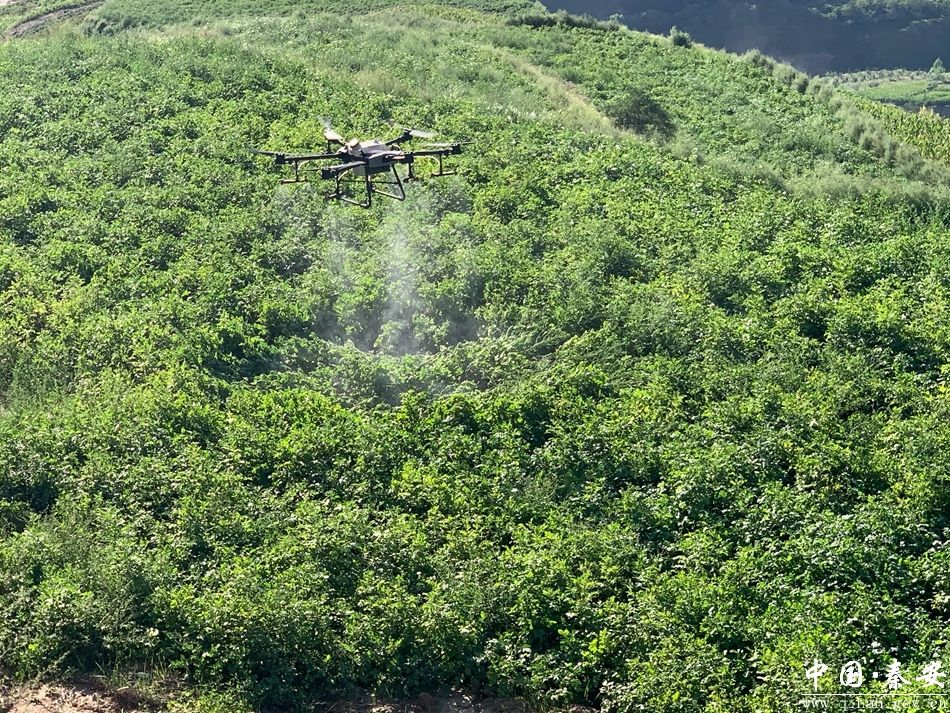 在王铺镇神仙岭流域马铃薯产业园,县植保技术人员围绕马铃薯晚疫病识别、防治方法、科学安全用药知识和防治作业安全知识等方面,为农户逐一讲解要点,引导种植户“预防为主、综合防治”,加强田间管理,突出绿色防控、绿色发展。随后,组织群众开展统防统治示范,利用植保无人机飞防马铃薯晚疫病200余亩,对不适宜无人机作业的零散地块组织专业机防队统防。