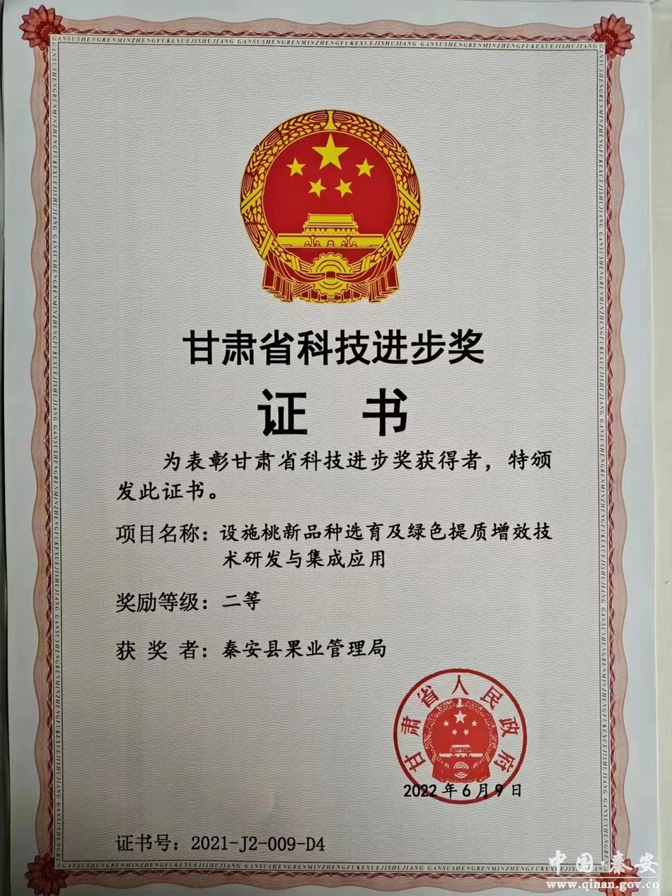近日,甘肃省科技进步奖发布。秦安县果业管理局参与完成的《设施桃新品种选育及绿色提质增效技术研发与集成应用》项目,获得了甘肃省科技进步奖二等奖。