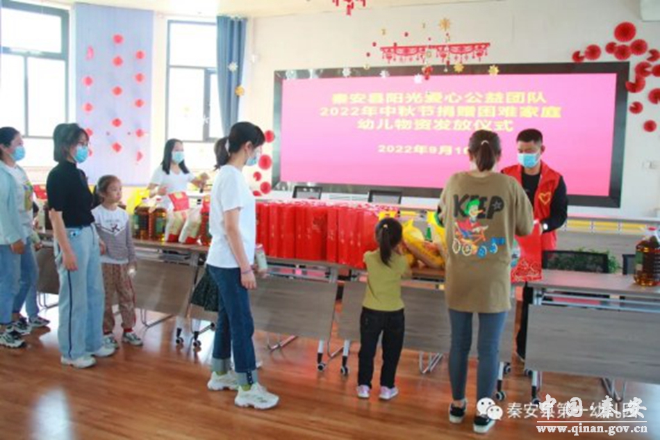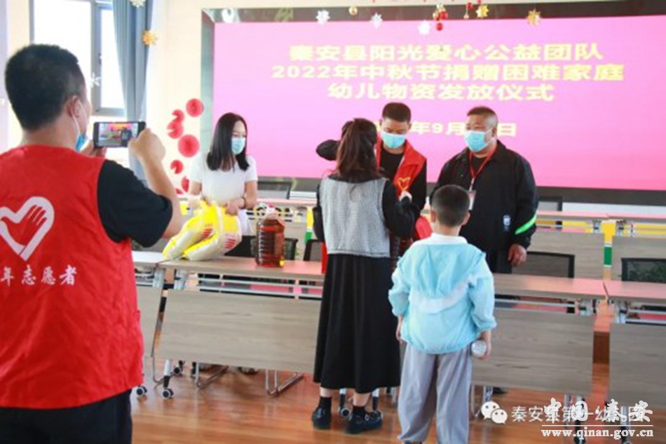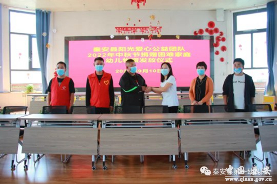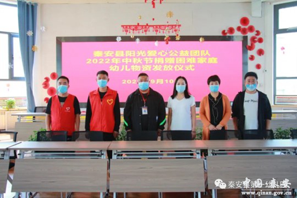 9月10日中秋节,秦安县阳光爱心公益团队为秦安县第一幼儿园困难家庭幼儿送去节日的问候和关爱,阳光爱心公益团队成员、县一幼领导班子成员和部分幼儿参加活动。