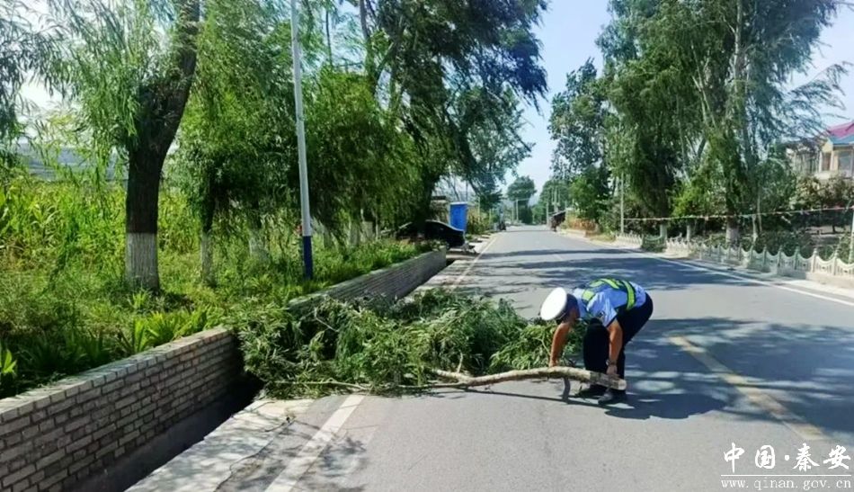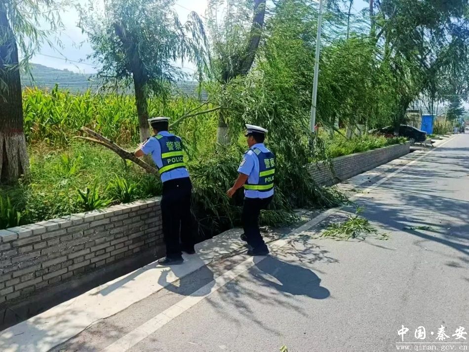 9月3日,秦安县公安局交警大队莲花中队民辅警在五营蔡河村路段开展巡逻时,发现一棵大树横在行车道内,严重影响车辆安全通行,为及时消除安全隐患,执勤民辅警立刻采取措施,及时移除树枝,保障道路安全畅通。