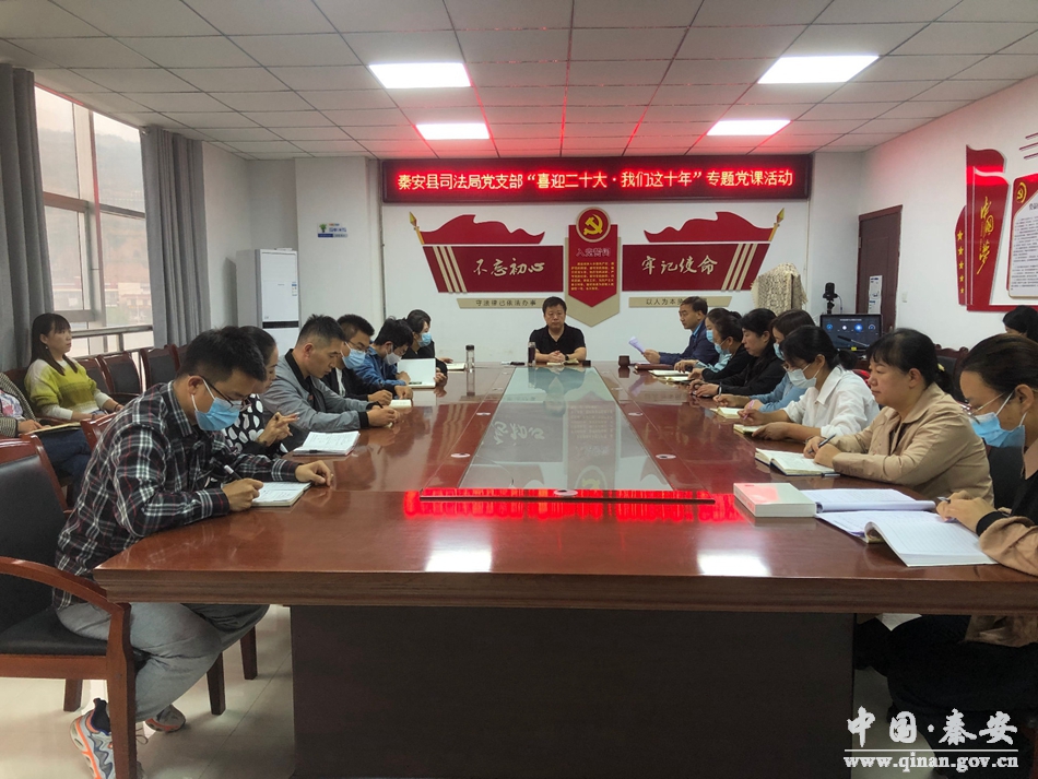 9月9日,秦安县司法局党支部组织开展9月份“主题党日”暨“喜迎二十大·我们这十年”专题党课活动,活动由局党支部书记主持,机关全体党员干部参加。 活动开始,支部书记以《敢担当守底线,做新时代不忘初心的合格党员》为题,以迎接党的二十大胜利召开为主线,围绕“我们这十年”党的建设、经济发展等方面,分别从牢记党的奋斗历程、做一名新时代不忘初心的合格党员两方面进行宣讲。带领全体党员回顾了中国共产党过去10年的奋斗历程,采取的一系列战略性举措,推进的一系列变革性实践,实现的一系列突破性进展,取得的一系列标志性成果。专题党课内容不仅有理论高度,还运用身边故事,结合社会热点,娓娓道来,满怀深情。党员们积极踊跃相互交流各自看法,从自身角度说变化、讲体会,让党课学习真正入脑入心。