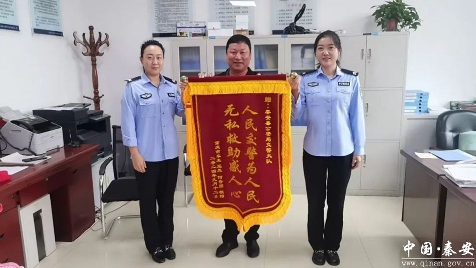 2024年9月20日,秦安县公安局交警大队收到一份来自重庆王女士送来的特殊“礼物”——一面印有“人民交警为人民 无私救助感人心”字样的锦旗,赞扬秦安县公安局交警大队无私为人民的态度以及快捷的办事效率。