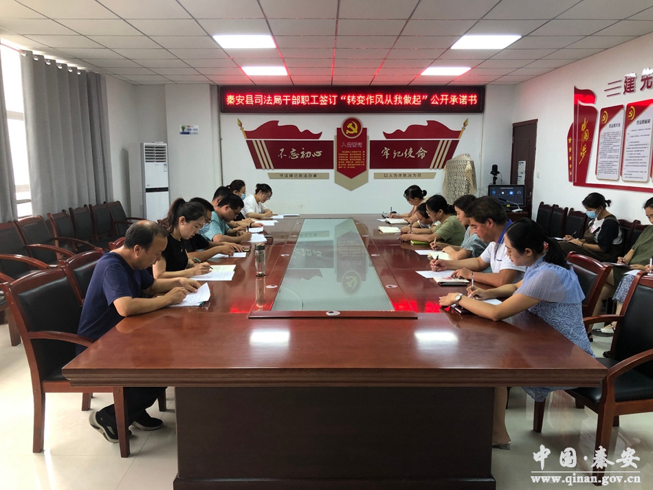为进一步推动“强作风、优服务、抓落实、促发展”作风建设年活动走深走实,持续转变干部作风,8月23日,秦安县司法局召开会议,发动干部签订“转变作风从我做起”公开承诺书。机关全体干部、公证处、天水知音律师事务所全体人员参加。