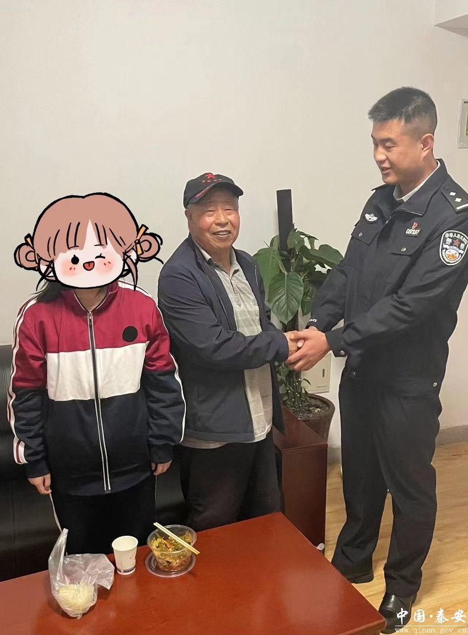 功夫不负有心人,在民辅警冒雨经过近五个小时的不懈努力下,终于在秦安县西滨河路找到了衣着单薄且冻得瑟瑟发抖的李某某。见到李某某并无大碍,民警心里悬着的一块石头才算是落了地,随后民警将其带至县公安局并为其送上热饭和热水,期间,民警又对其进行了心理疏导和安慰,待情绪稳定后,民警将李某某安全交至其爷爷和奶奶手中。看到孙女安然无恙,两位老人连连向民警致谢。