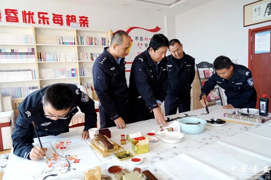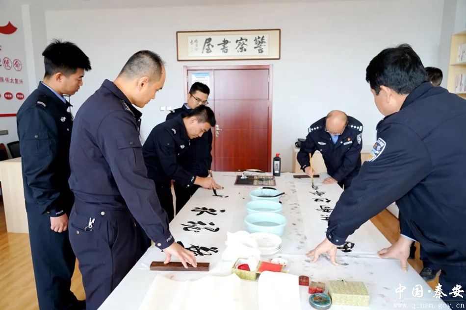 在警营文化活动中心,秦安公安文联会员们和具有文学艺术特长的民辅警一同挥毫泼墨,即兴创作,抒写警营风采,创作出了一幅幅栩栩如生的山水、花鸟等绘画作品和风格迥异的书法作品,把“忠诚、担当、为民、奉献”倾注在自己的作品中,生动刻画了人民警察的忠诚本色、为民情怀和时代风貌。