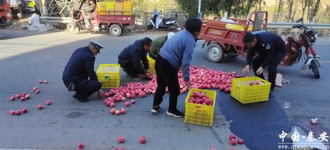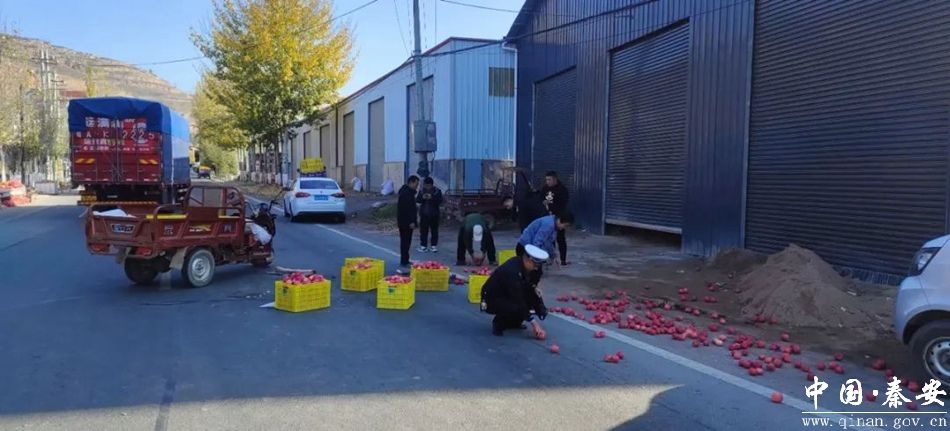 11月4日上午,秦安县公安局交警大队事故中队接到110指令:“叶莲公路万华酒店路段有一辆三轮车与小轿车发生事故,导致三轮车侧翻,苹果散落。”接警后,事故中队民辅警立即出动警力赶赴现场进行处置。