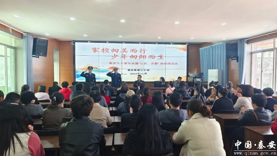 11月8日,秦安县公安局交警大队宣传民辅警来到秦安县第三小学,在家长会上为学生和家长宣传交通安全知识,并通过主会场让各班以直播的形式观看。