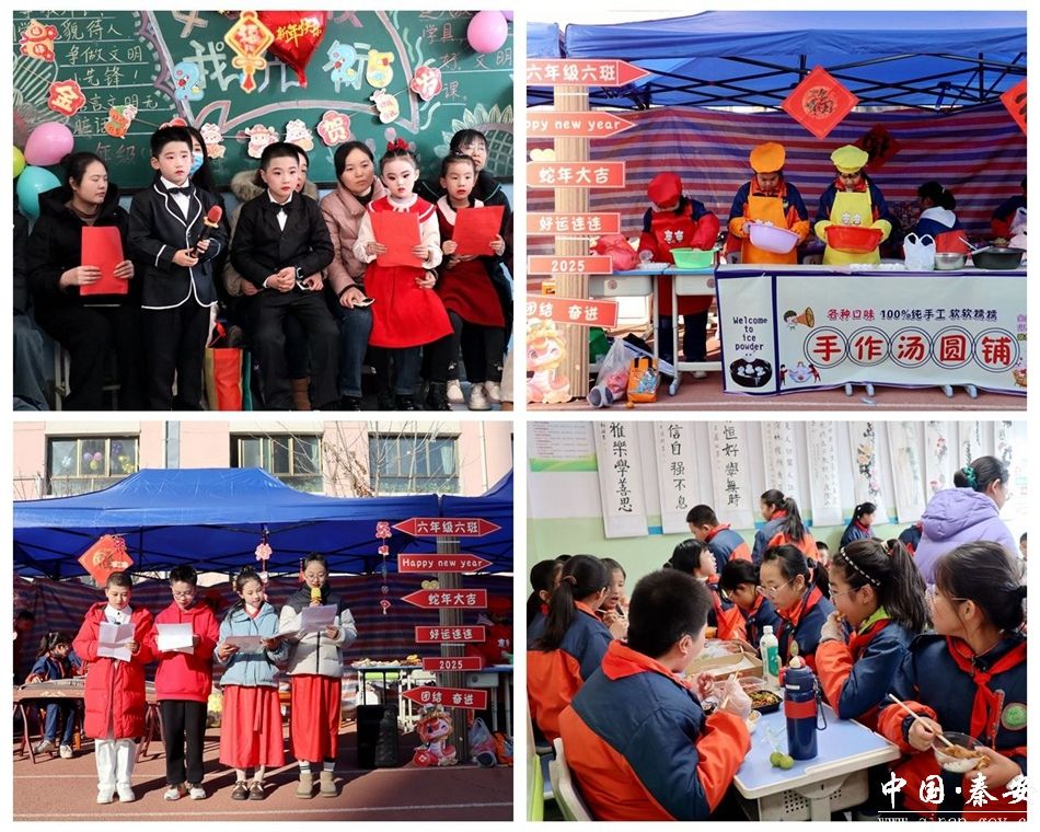 此次活动以“童心飞扬 欢庆元旦”为主题。活动当天,学校读书长廊、文化长廊里摆满了由三、四、五年级组制作的贺卡、剪纸、书画、皮影等手工制作展品。一件件精巧的手工作品,一张张精美的贺卡,一幅幅精湛的绘画,一个个鲜活的皮影人物,不仅展现了同学们的艺术创造力,也寄托了他们对未来生活的美好期望。六年级组的“灯转华夏,谜语千秋”灯谜展以及糖葫芦、汤圆、烧烤、关东煮、牛肉面、捏糖人等美食制作活动吸引了众多同学的目光和味蕾。由四年级组筹备的年货市场更是点燃了校园的浓郁节日氛围,“卖年货啦!卖年货啦!”同学们热情洋溢的叫卖声让校园热闹非凡。低年级组的文艺汇演在各班教室里精彩上演,同学们用歌声讴歌美好校园,以舞步描绘多彩童年,通过展示各项才艺,张扬自我,他们用心诠释着对艺术的理解,表达着对生活的热爱。