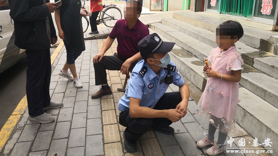接警后,民警立即赶赴现场,发现一名小女孩站在路边无助地四处张望,民警便俯下身子安抚小女孩情绪,并试图与其沟通。由于小女孩年龄太小,无法准确叙述自己及家长的姓名,民警只获取了小女孩今年3岁和跟随奶奶从安伏镇麻湾村到秦安县城探望父母的信息。